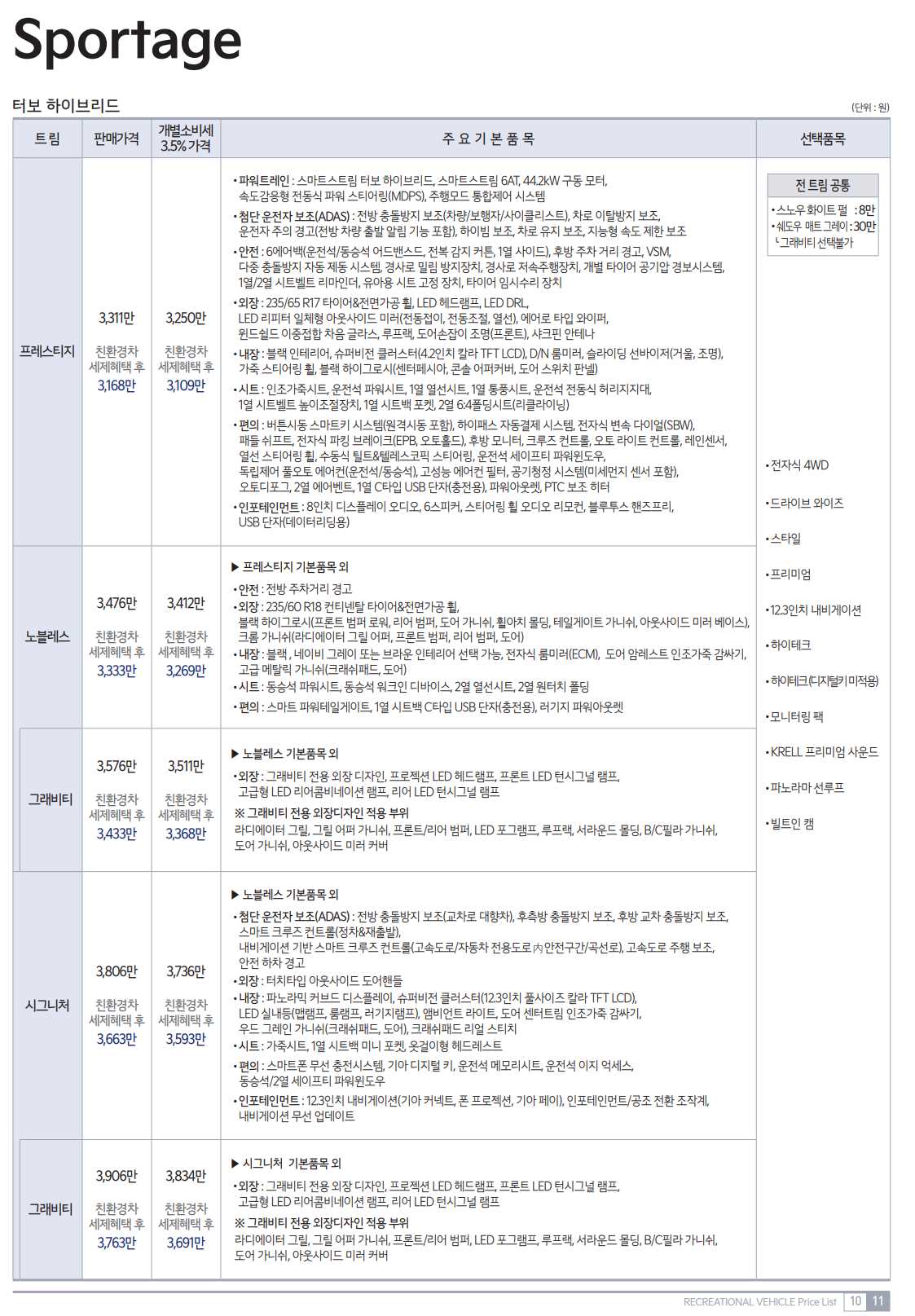 스포티지 하이브리드 가격은 친환경 세제혜택 후 프레스티지가 3,109만원, 노블레스 3,269만원, 노블래스 그래비티 3,368만원, 시그니처 3,593만원, 시그니처 그래비티 3,691만원으로 구성되어 있습니다.