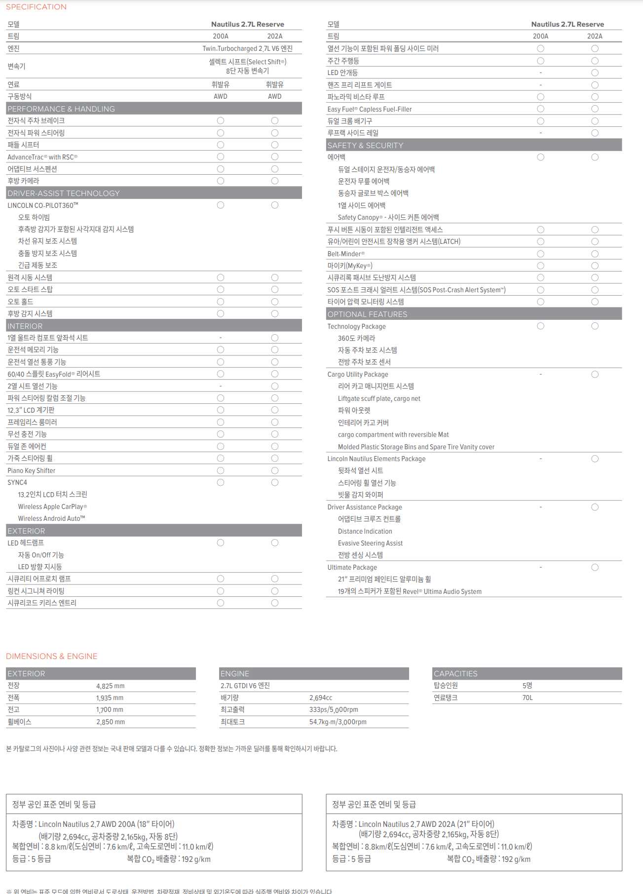 후면 역시 기존과 2019 노틸러스와 동일하다. 길게 이어진 테일램프 위로는 링컨 레터링을 삽입했다. 모델명 레터링은 측면 펜더에 위치해 전반적으로 깔끔한 느낌이다. 또한 범퍼 하단에 듀얼 머플러를 적용해 스포티한 감성을 더했다. 신규 외장 색상으로는 에셔 그레이, 그린 잼과 함께 링컨의 시그니처 색상인 플라이트 블루 컬러가 적용됐다.