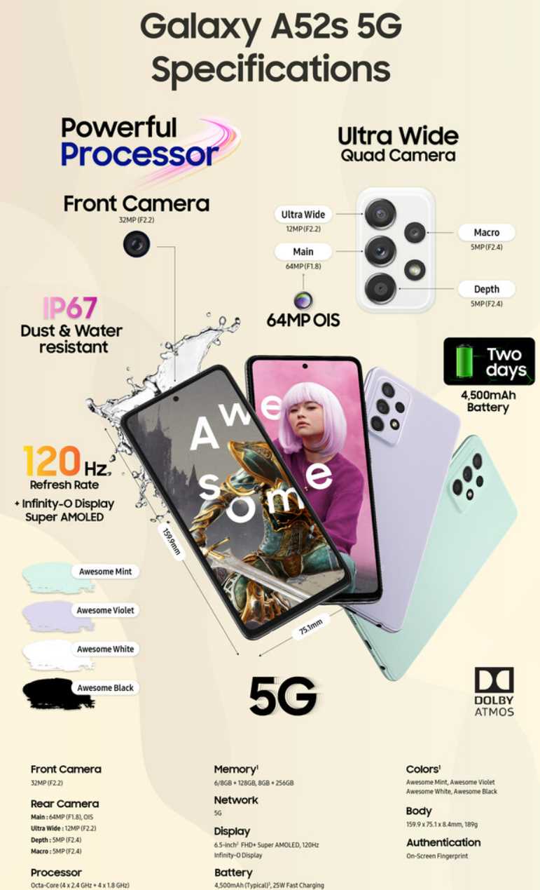 갤럭시 A52S은 갤럭시 A52 상위형 형제 모델로, 20:9 비율의 디스플레이를 탑재하여 기기 전면 대부분이 디스플레이로 가득 차있다.