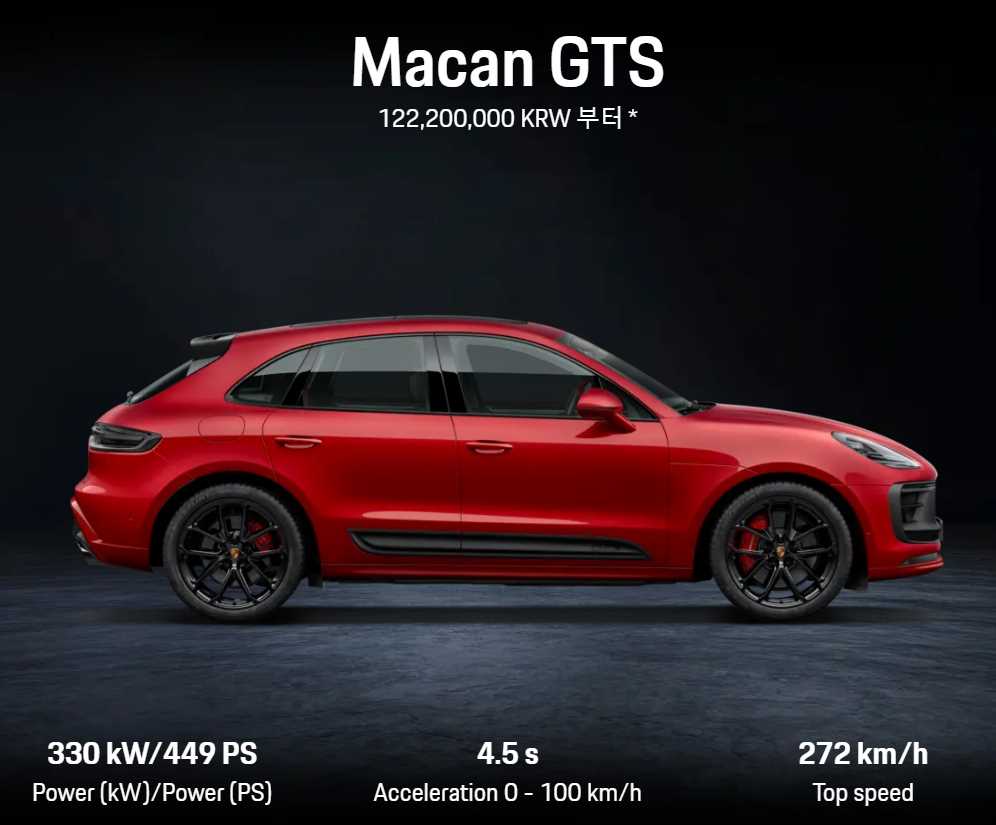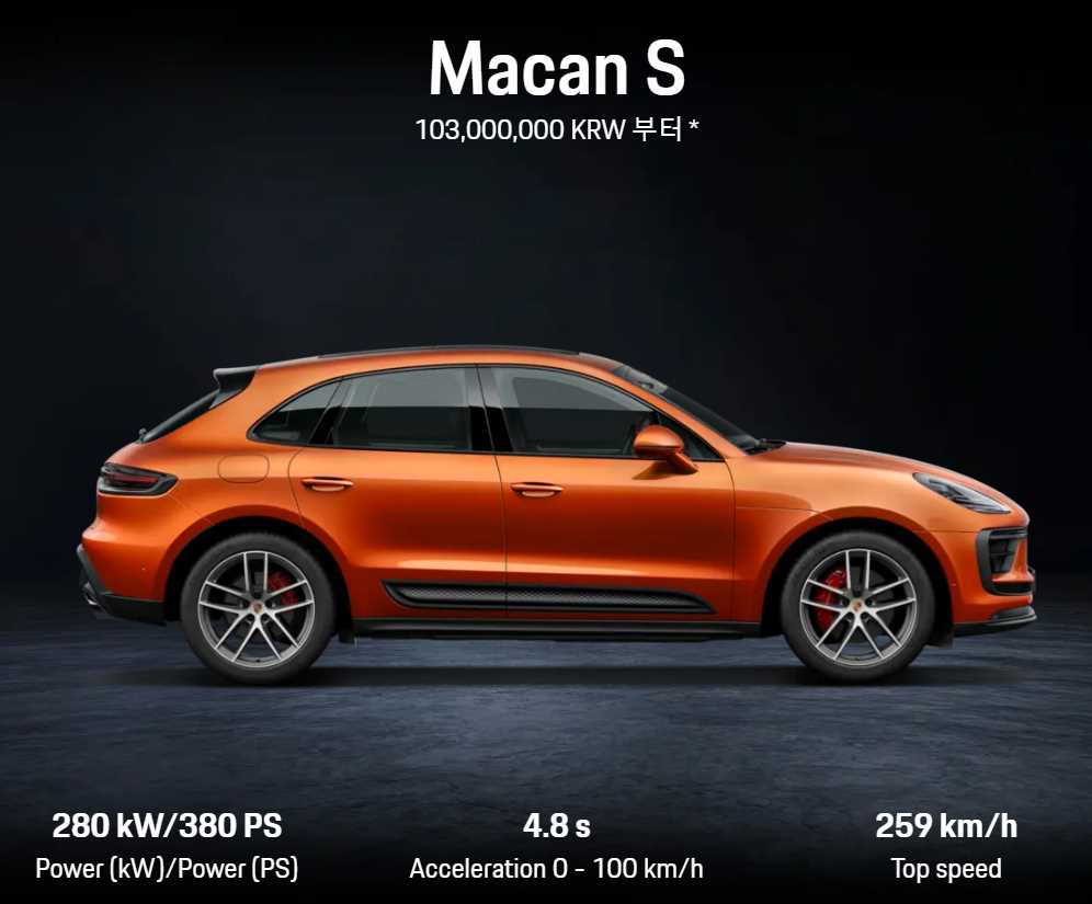 마칸 S는 최대 380마력을 자랑하며 제로백은 4.8초에 이르며, 마칸GTS는 440마력에 4.5초에 제로백 성능을 보여줍니다. SUV이지만 스포츠카 못지 않은 성능을 발휘하는 제원을 가지고 있습니다.