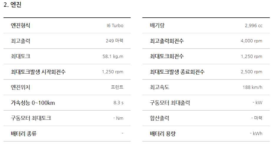 | 등급 | 연료 | 배기량 | 연비 | 가격 |