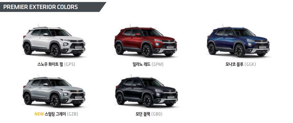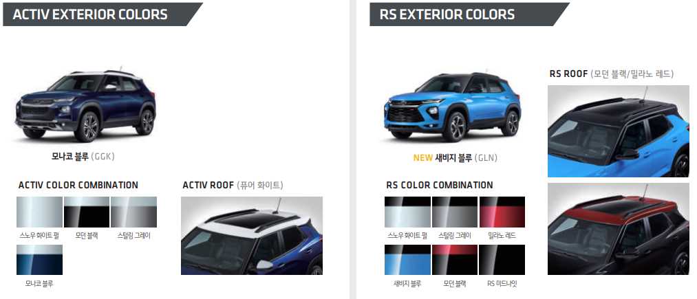 쉐보레 트레일블레이저 색상은 스노우 화이트펄, 밀라노 레드, 모나코 블루, 스털링 그레이, 모던 블랙 5가지 색상을 제공하며, 액티브는 모나코 블루에 부분 색상 옵션을 가질 수 있습니다.