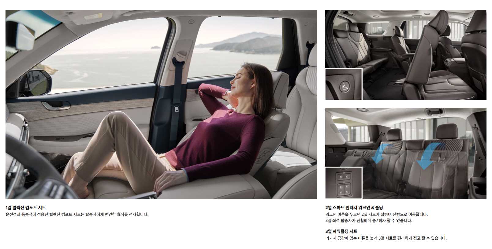 - 시트:캘리그래피 전용 퀼팅 나파가죽 시트(블랙/브라운/웜그레이 컬러),동승석10way전동시트(레그레스트포함), 동승석2way럼버서포트,동승석워크인디바이스,3열파워폴딩시트,윙타입헤드레스트(2열),운전석에르고모션시트 (18way,볼스터전동조절,레그레스트,스트레칭모드포함),1열릴렉션컴포트시트,3열열선시트,스마트자세제어