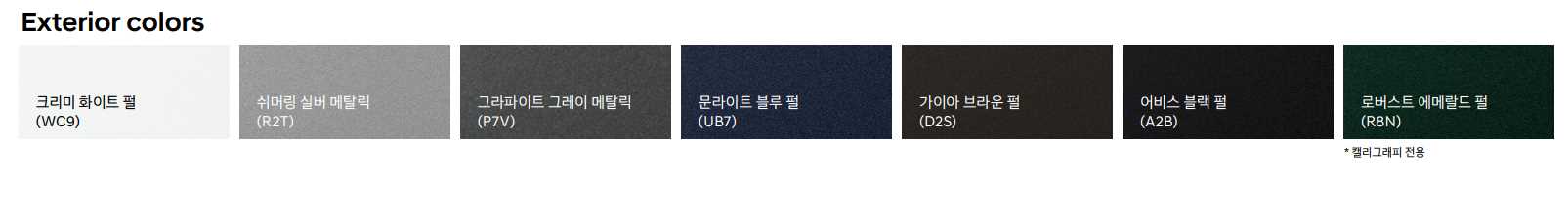 - 외관:캘리그래피 전용 디자인(휠, 라디에이터 그릴&가니쉬, 인테이크 그릴, 바디컬러 클래딩, 프론트&리어 크롬 스키드 플레이트)
