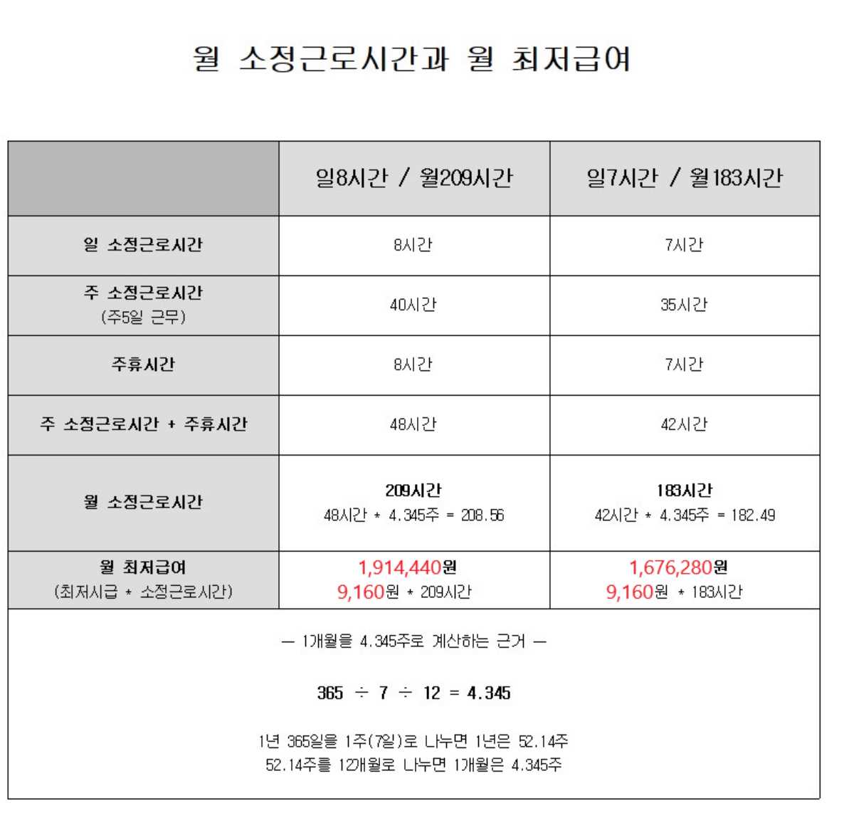 일 8시간씩 5일을 근무하거나, 일 7시간씩 5일을 근무한 경우는 월 최저급여가 위에 표와 같습니다.