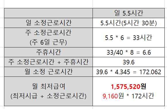 일 5.5시간(5시간30분)을 근무하고, 주 6일을 일할 경우 계산 법입니다.