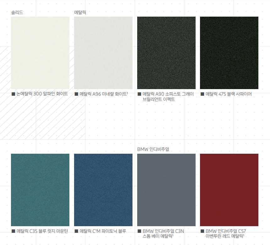 BMW iX는 논메탈 화이트, 메탈릭 화이트, 그레이, 블랙사파이어, 블루 릿지 마운틱, 파이토닉 블루, 스톰베이, 레드 메탁릭 등의 8가지 컬러를 제공하고 있습니다.