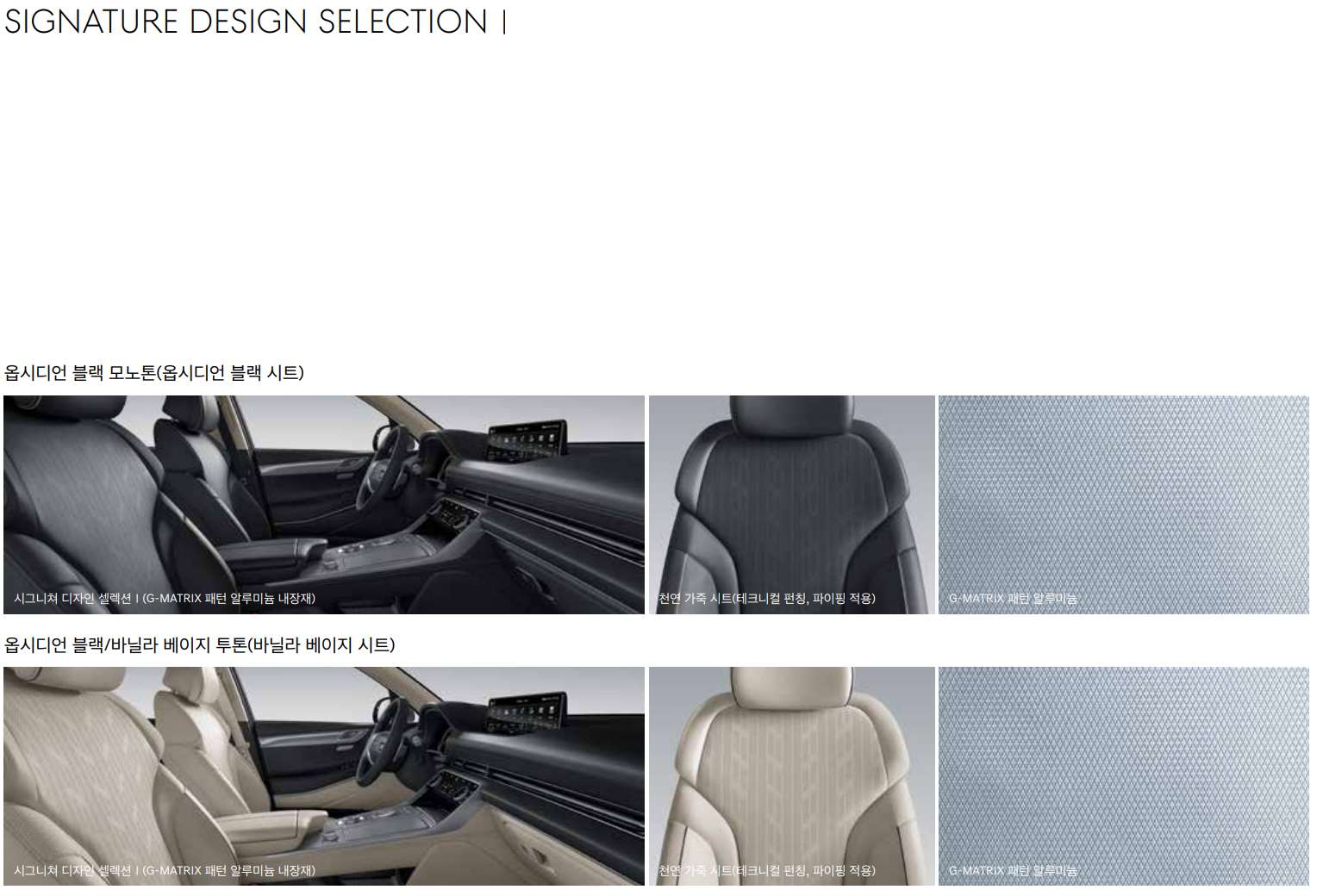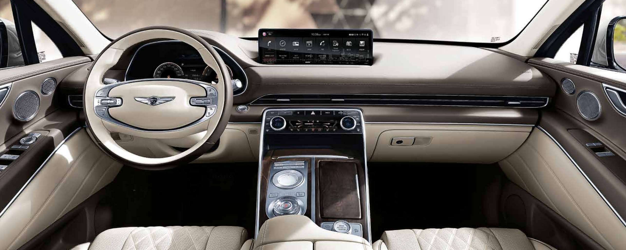 내장 8인치 TFT LCD 클러스터, 전자식 변속 다이얼(SBW), 제네시스 통합 컨트롤러, 패들쉬프트, 하이패스 시스템, 프레임리스 룸미러(ECM), 블랙 하이그로시 내장재, 터치타입 공조 패널, 앰비언트 무드램프, 앞좌석 LED 풋램프