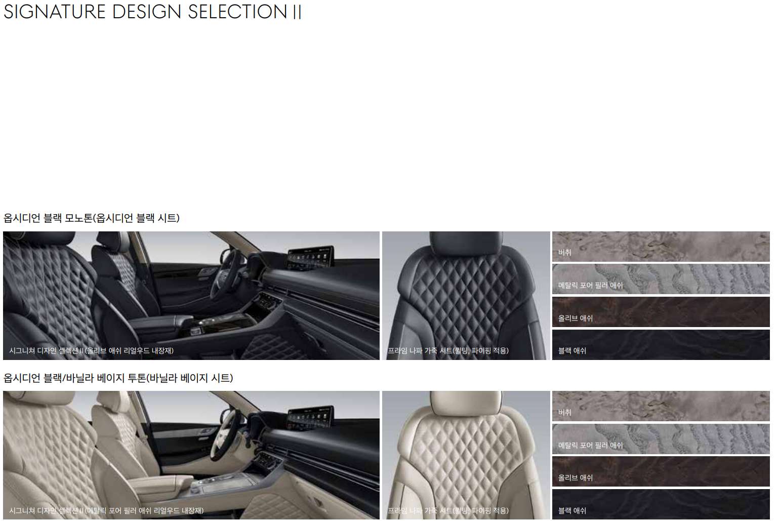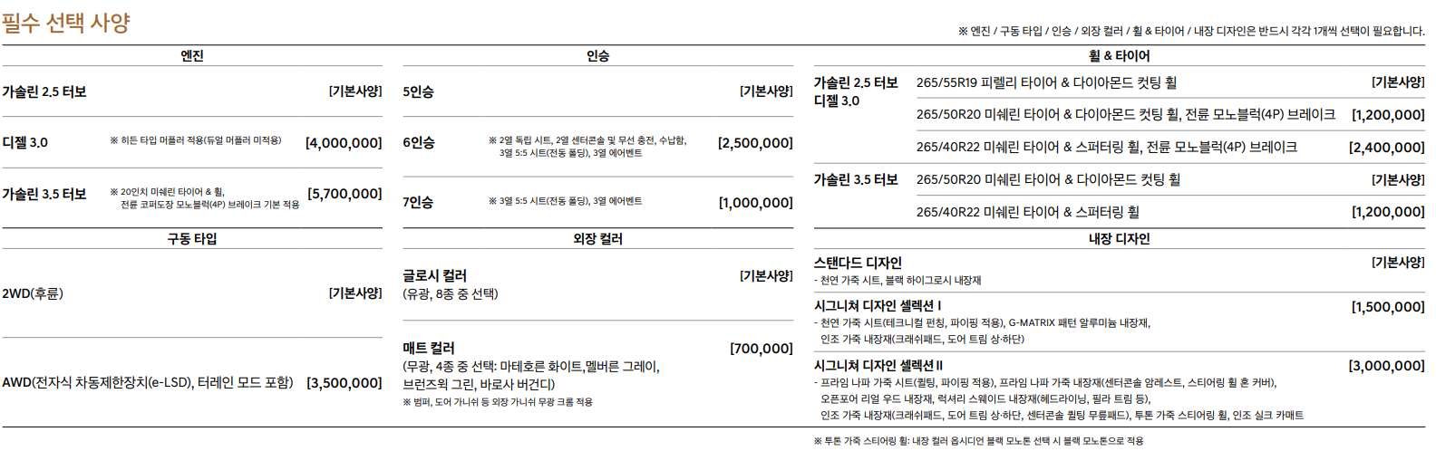 시트 천연 가죽 시트, 운전석 전동시트(12방향, 럼버서포트 포함), 동승석 전동시트(12방향, 럼버서포트 포함), 동승석 워크인 디바이스, 운전석 자세 메모리 시스템(스마트 자세제어 시스템 포함), 앞좌석 통풍 & 열선 시트, 뒷좌석 열선 시트, 2열 4:2:4 원터치 폴딩, 2열 수동 슬라이딩 및 리클라이닝, 2열 암레스트 수납함