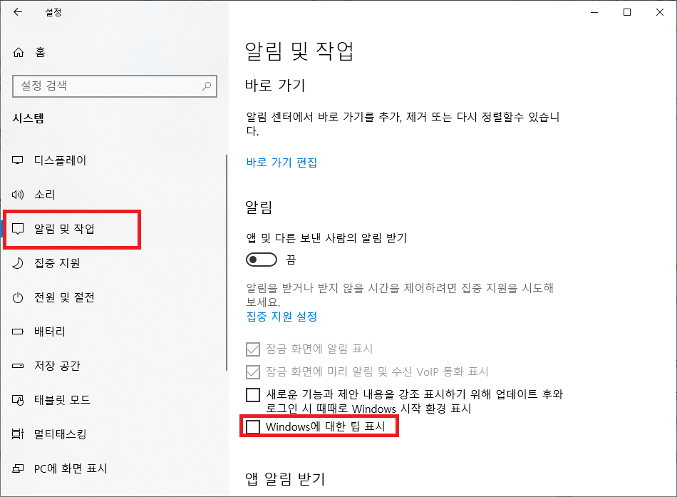 좌측에서 알림 및 작업을 선택한 뒤, Windows에 대한 팁 표시에 대한 선택을 해제 하여 줍니다.