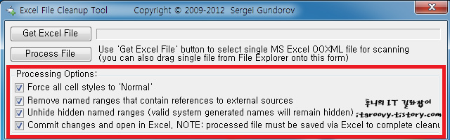 그러면 Excel File Cleanup Tool 이라는 프로그램이 뜨게 되는데, 아래에 4가지 옵션을 모두 선택한 뒤, Get Excel File 버튼을 선택해서, 문제가 되는 파일을 선택하여 줍니다.