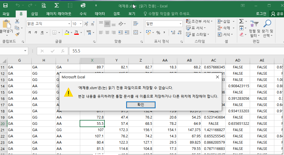 읽기전용으로 된 파일을 저장하려하면, 다음과 같이 읽기 전용 파일이므로 저장할 수 없습니다. 변경 내용을 유지하려면 통합 문서를 새 이름으로 저장하거나 다른 위치에 저장해야 합니다. 라고 나와서 저장이 불가능 합니다.