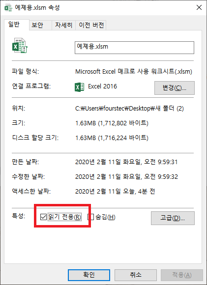 그리고는 일반 탭에 특성에 보면, 읽기 전용을 선택 해제하여 줍니다. 그리고 확인을 눌러줍니다.