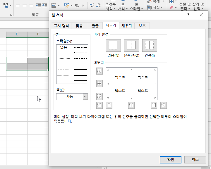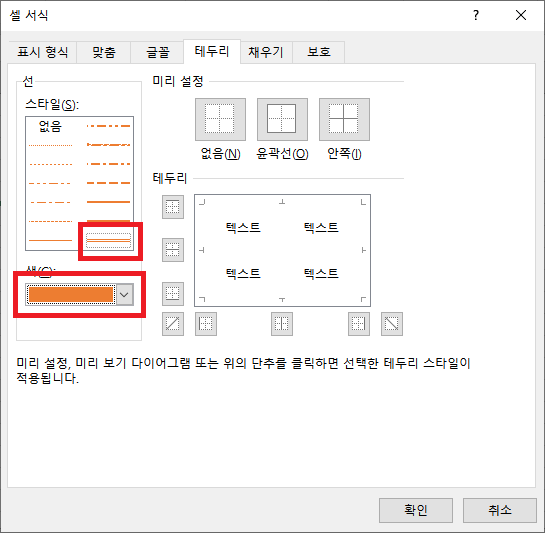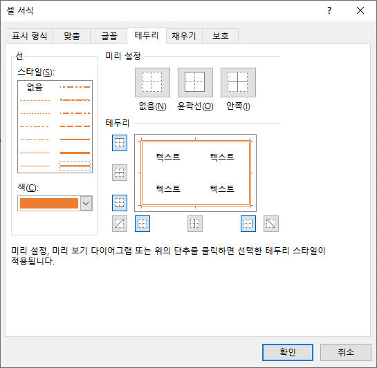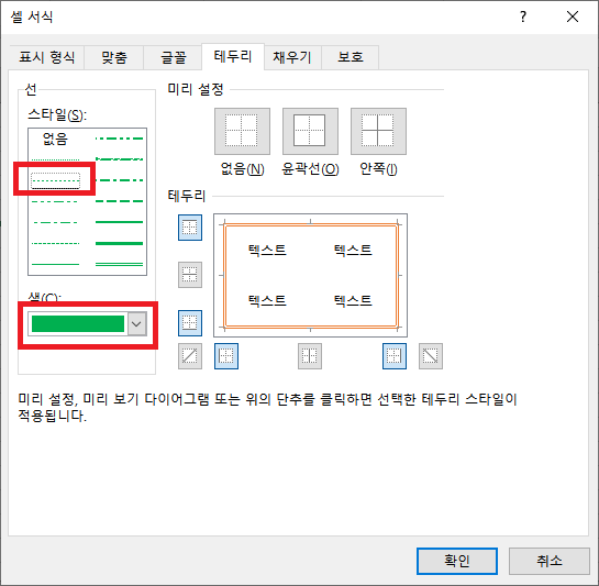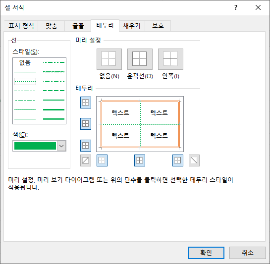 그러고서 테두리 탭으로 가시면, 여러가지를 설정하실 수 있습니다. 기본적으로 선 스타일과, 그리고 원하는 테두리 위치를 하나하나 지정이 가능하며, 색상도 지정이 가능합니다.