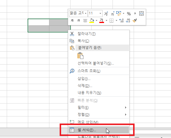 먼저 테두리를 설정할 셀의 범위를 설정합니다. 그리고 마우스 우클릭을 해서 셀서식으로 들어가줍니다.