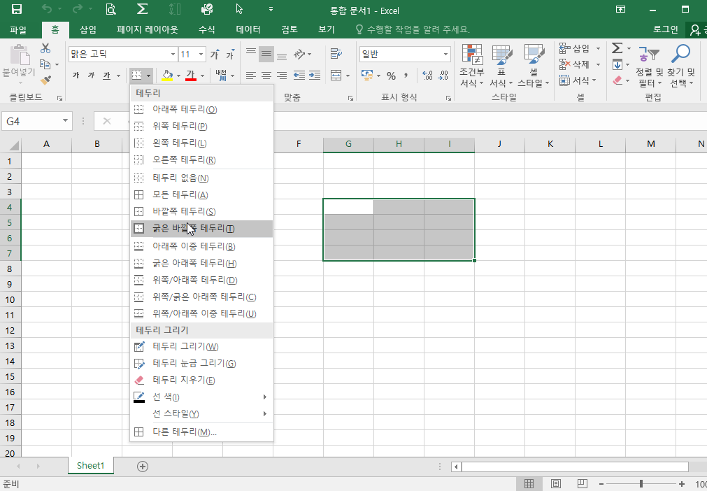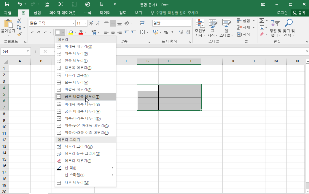 굵은 바깥쪽 테두리를 선택하면, 선택된 범위에서 가장 바깥쪽 테두리면 굵은선으로 변경됩니다.