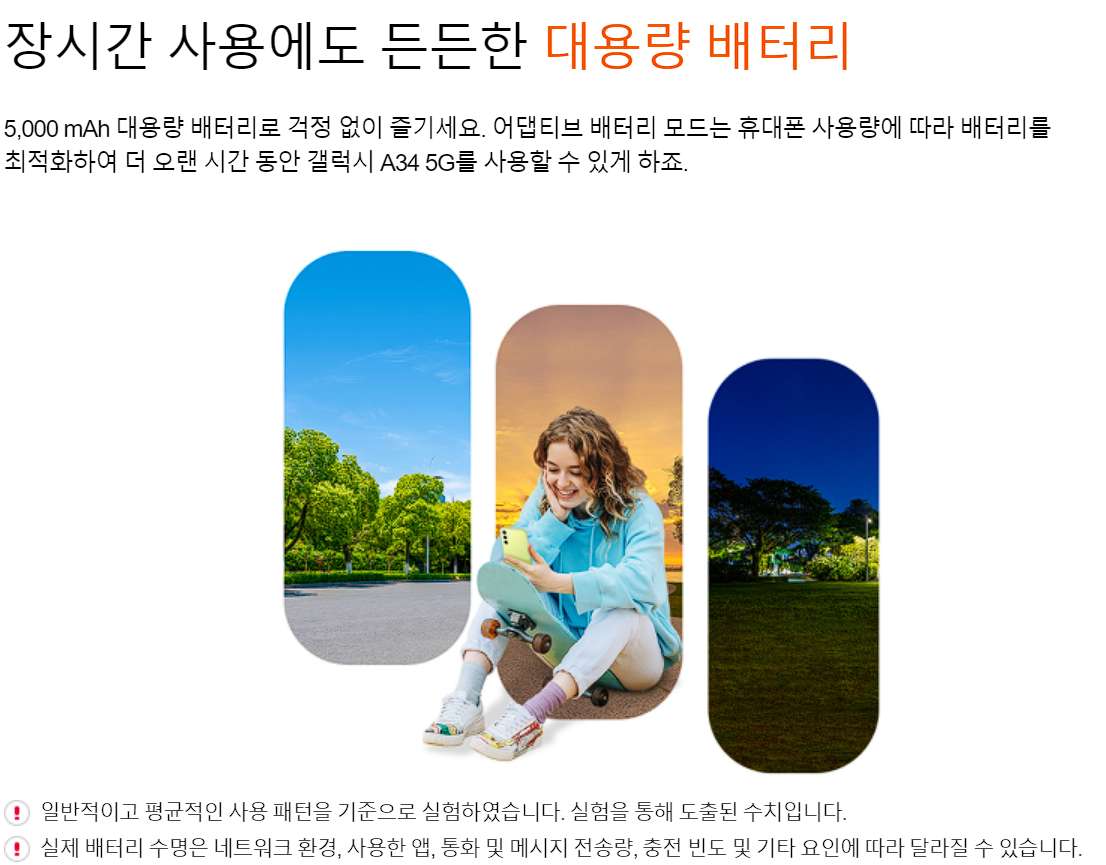 갤럭시 A34 5G는 5,000mAh 대용량 배터리를 탑재해서, 하루종일 배터리 사용하는데 문제가 없으며, 어댑티드 배터리 모드를 지원해서, 휴대폰 사용량에 따라 최적화된 배터리 사용시간을 제공합니다.