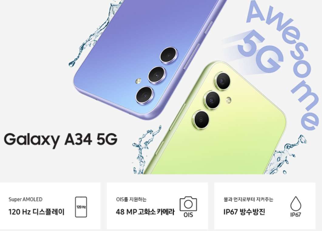 갤럭시 A34 출고가 499,400원으로 중저가 보급형 라인 5G 스마트폰으로, 가성비가 높은 스마트폰입니다. 보급형임에도 불구하고 120Hz 수퍼 아몰레드를 탑재하였으며, OIS를 지원하는 48MP 고화소 카메라, IP67 등급에 방수방진 기능까지 탑재한 다재다능한 녀석입니다.