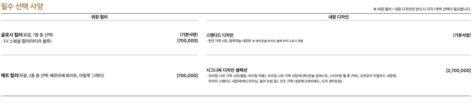 시트 천연 가죽 시트, 운전석 전동시트(12방향, 럼버서포트 포함), 동승석 전동시트(12방향, 럼버서포트 포함), 동승석 워크인 디바이스, 운전석 자세 메모리 시스템(스마트 자세제어 시스템 포함), 앞좌석 통풍 & 열선 시트, 뒷좌석 열선 시트, 뒷좌석 스키쓰루