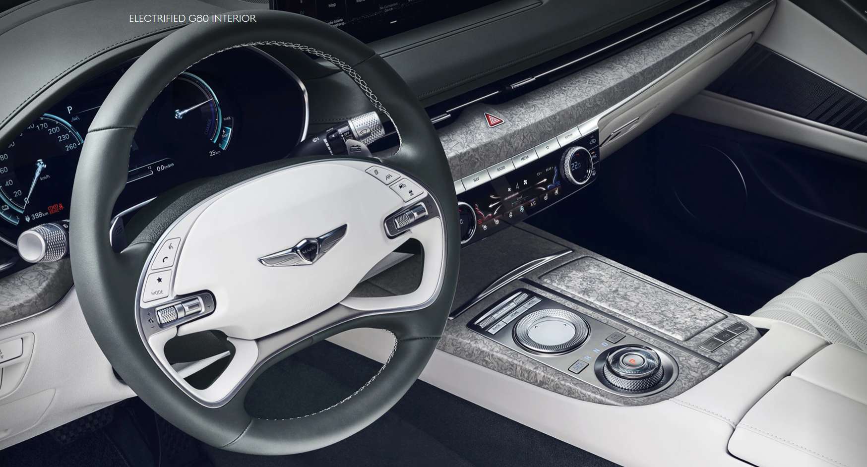 내장 8인치 TFT LCD 클러스터, 전자식 변속 다이얼(SBW), 제네시스 통합 컨트롤러, 회생제동 컨트롤 패들쉬프트, 하이패스 시스템, 프레임리스 룸미러(ECM), 알루미늄 내장재, 터치타입 공조 패널, 앰비언트 무드램프, 앞좌석 LED 풋램프, 메탈 도어스커프, 투톤 가죽 스티어링 휠(옵시디언 블랙 모노톤 선택 시 블랙 모노톤으로 적용)