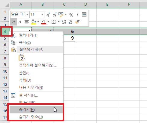 4행을 숨기기고 싶다면, 4행에 아무 셀이나 선택을 한뒤, Ctrl + 9 버튼을 눌러주면 행이 숨겨집니다.