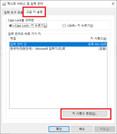 그런 뒤 고급 키 설정으로 가서 키 시퀀스 변경을 선택하여 줍니다.