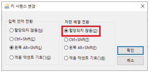 그리고는 자판 배열 전환에서 할당되지 않음을 선택한 후 확인을 눌러줍니다.
