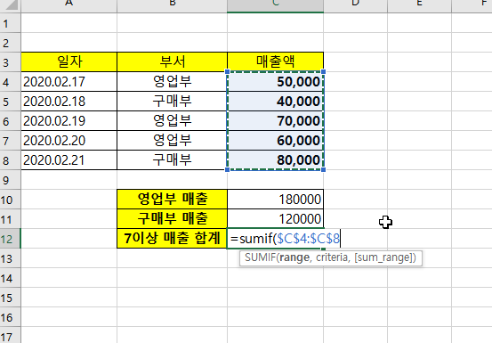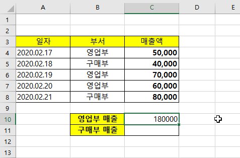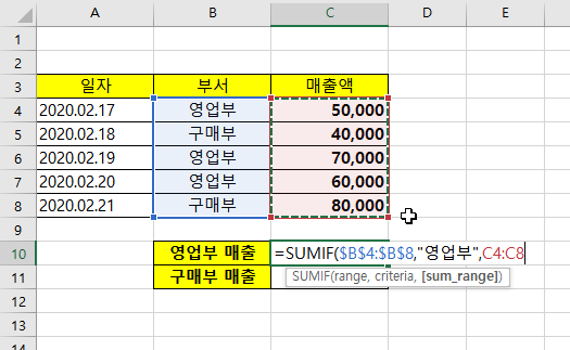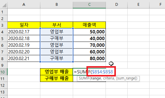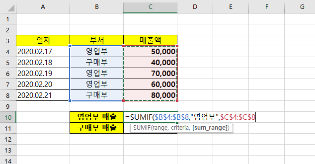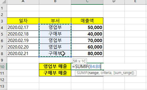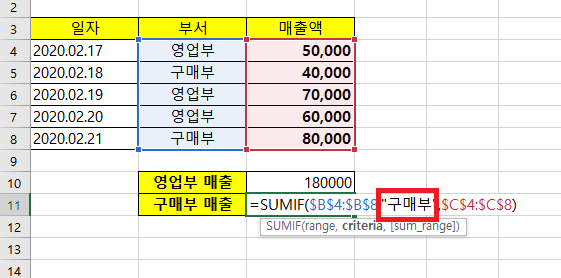 아래와 같이, 영업부와 구매부 매출의 합계를 구하려고 한다고 합니다. 이럴때 SUMIF를 사용하면 간단하게 매출들의 합계를 구할 수 있습니다.