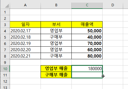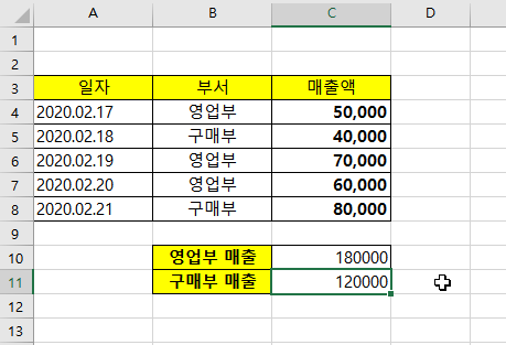 그러면 영업부의 합계 금액이 계산 됩니다.(50000+70000+60000 = 180000)