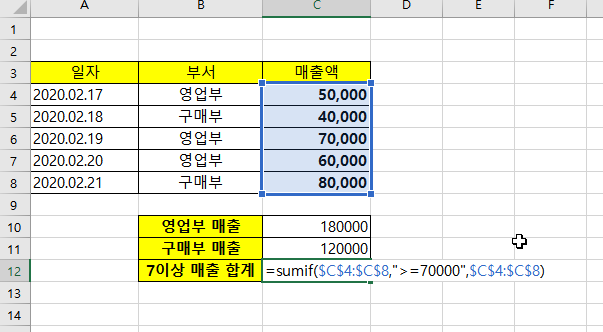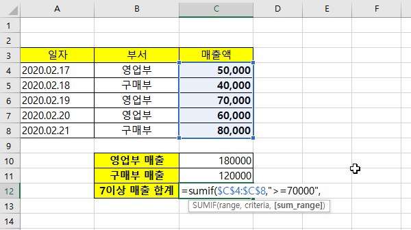 응용을 해보도록 하겠습니다. 이번에는 7만원이상인 매출액에 대한 합계를 알아보는 SUMIF를 해보겠습니다.