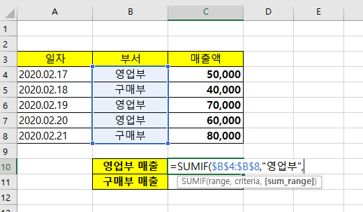 그럼뒤 콤마( ,)를 입력 후, 부서 중에 영업부의 합계를 구해야 하므로, "영업부" 라고 입력하주고 콤마( ,)를 입력하여 줍니다.