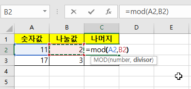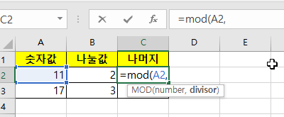 먼저 나머지를 구할 셀을 선택하고 =mod( 를 입력하고, 나머지를 구하려는 값을 선택하여 줍니다.
