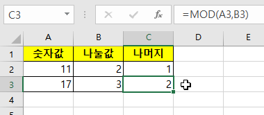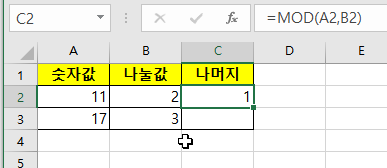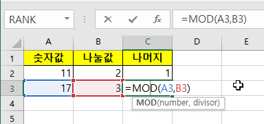 그러고 나면 17을 3으로 나눈 나머지 2가 값으로 나오게 됩니다.