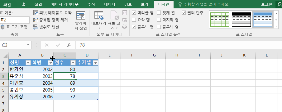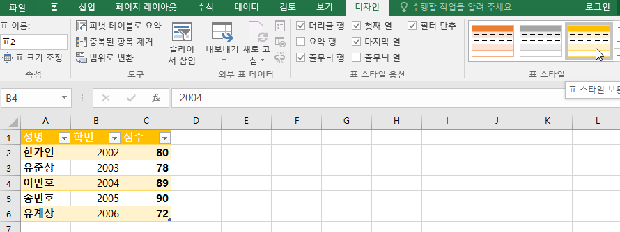 그러면 기본적인 스타일로 표가 설정됩니다. 디자인탭에서 표의 디자인과 서식들을 변경해줄 수 있습니다.