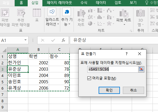 그러면 지금까지 입력한 데이터가 데이터로 지정되고 확인 버튼을 눌러줍니다.