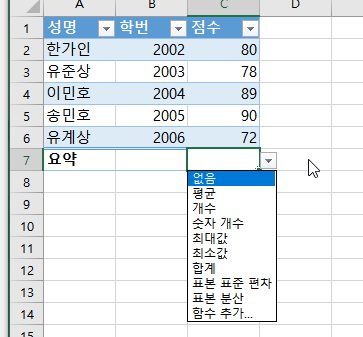 요약 행은 맨아래 한행이 추가 되며, 숫자값들에 대한 평균 개수, 합계 등등 설정이 가능합니다.