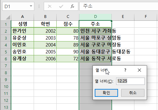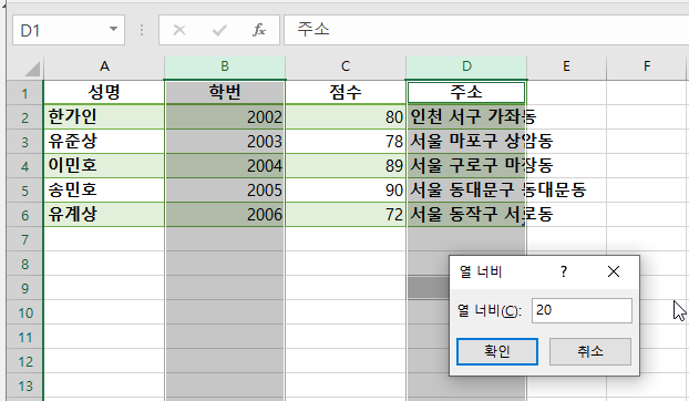 다음과 같이 선택하였던, B열과 D열만 너비가 늘어난걸 확인하실 수 있습니다.