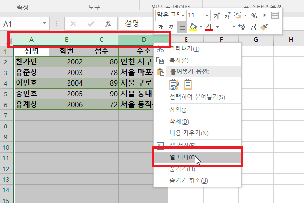 그리고서는 마우스 우클릭하여 열너비를 선택하여 수정해주시면 됩니다.