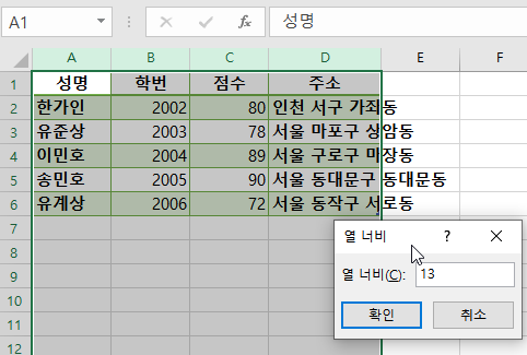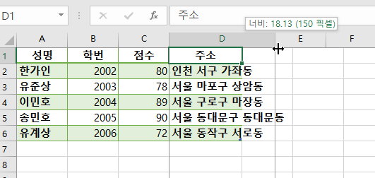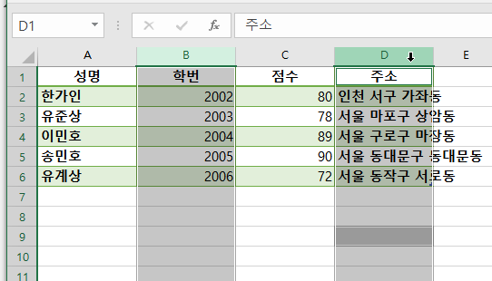 만약 일부 셀 크기만 변경하고 싶다고 하시면, 키보드에서 Ctrl을 누른채 열을 선택하여 주세요.