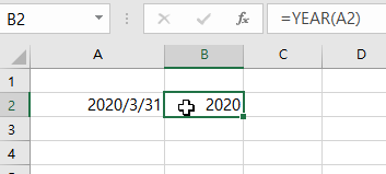 날짜가 있는 셀에서 연도만을 추출해서 보여줍니다. =year( 를 입력 후 날짜가 있는 셀을 지정해주시면 됩니다. 그리고 괄호를 닫아서 수식을 마무리해주면 됩니다.