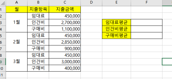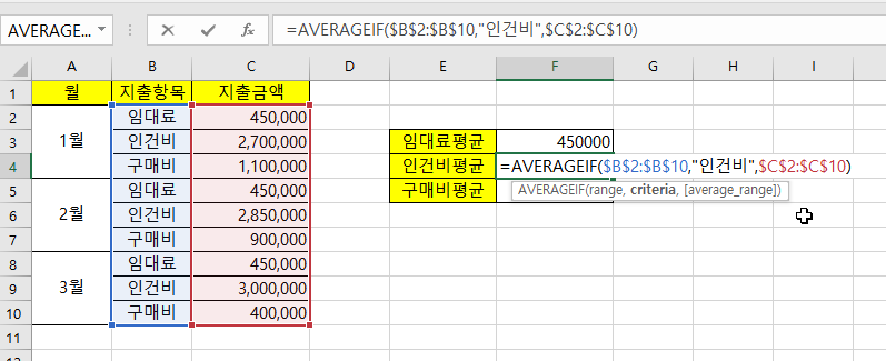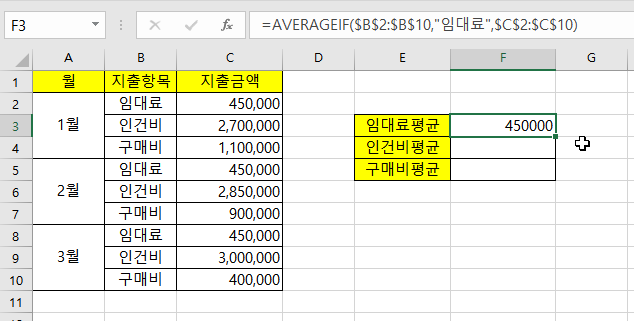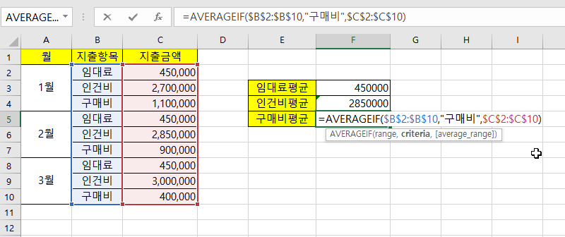 임대료나 인건비 등에 평균을 구하기 위한 예제를 통해, AVERAGEIF 함수를 사용하는 방법을 쉽게 알아보겠습니다.