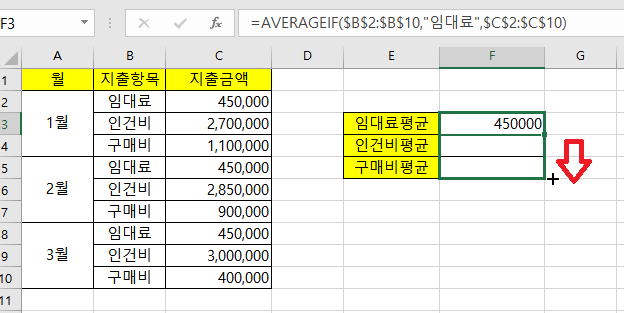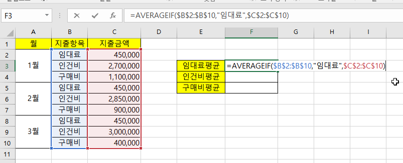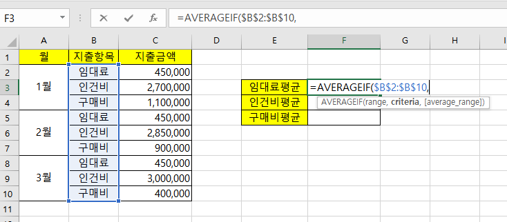 임대료평균을 먼저 구해보고, 나머지는 자동채우기를 이용해보겠습니다. 먼저 =AVERAGEIF( 를 입력 후, 지출항목을 범위 선택하여줍니다. 그리고 F4를 눌러서 절대참조로 변경하여 줍니다.