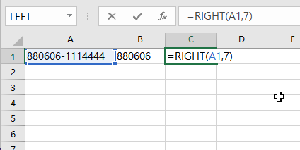 이 함수의 기능은 텍스트를 오른쪽을 기준으로 시작하여, 원하는 자릿수 만큼 추출할 수 있습니다. 이번에는 주민번호가 있는 셀에서 주민번호 뒷자리 7자리를 추출하여 보겠습니다.