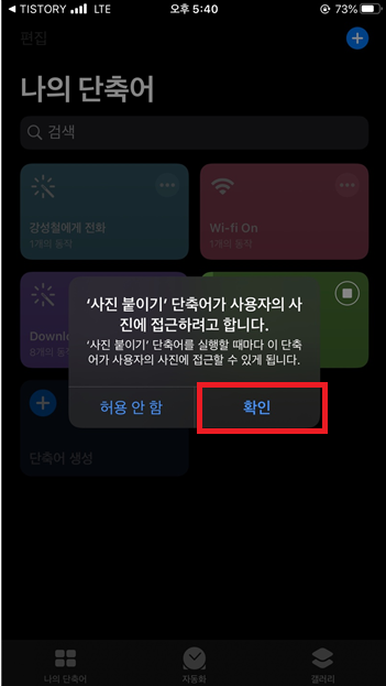 그러면 단축어에 사진 붙이기가 추가된걸 확인하실 수 있습니다. 그리고는 사진 붙이기 단축어를 선택하여 주면, '사진 붙이기' 단축어가 사용자의 사진에 접근하려고 합니다. 라는 메시지가 뜨면 확인을 눌러주세요.