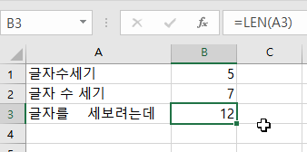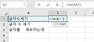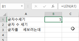 아래 있는 데이터도 자동채우기를 통해서 확인해보면, 2번째 텍스트는 띄어쓰기가 2개 있기 때문에 7이라고 나오고,