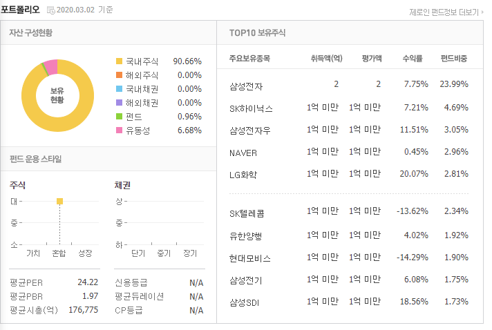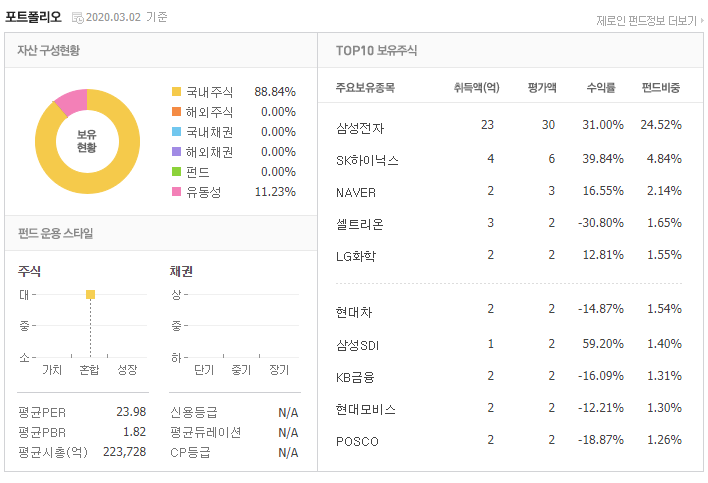 열심히 찾다보니, 거의 대부분의 펀드의 삼성전자의 비율이 대략 25%정도는 차지하는 것 같습니다. 워낙 우량주이다보니, 펀드매니저들도 리스크를 줄이기 위해서 활용되는거 같기도 하네요. 이 펀드는 KOSEF 200에 투자하는 비율이 20%나 되서 인덱스 펀드를 그래도 조금 느낄 수 있는 펀드가 아닌가 싶습니다. 다만 KOSEF 200에서 삼성전자의 구성비중이 30%나 되기 때문에, 이 펀드의 삼성전자 비중은 30%가 넘어갈듯 싶습니다.