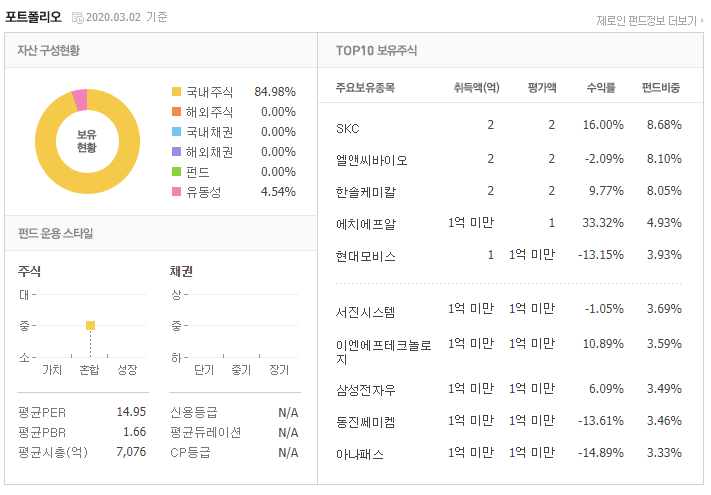 개인적으로 SK텔레콤와 현대모비스가 향후 미래가 가치가 크다고 전 판단해서, 이런 종목들의 비중이 어느정도 있는 종목을 선호합니다. (이 펀드에는 비율이 조금 적은 편이긴 합니다.)
