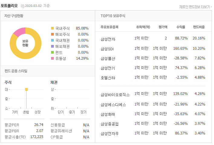 주로 삼성전자, 삼성물산, 삼성화재, 제일기획등 여러 업종별로 경쟁력이 높은 삼성그룹에 소속되어 있는 주식 위주로 투자하는 펀드 상품입니다. 삼성그룹주라고도 불리며, 60%이상이 국내주식에 투자되는 상품입니다. 설정액이 17억으로 적어서 좀 아쉽긴하나, 총보수가 0.4%정도 밖에 안될정도로 낮고, 또한 삼성을 기반으로하여 투자하는 상품이니 적은 비중으로 투자를 하는 것도 좋은 방법일 듯 싶습니다.