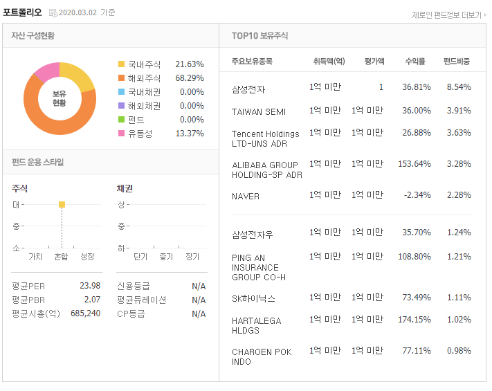 찾은 펀드 중에 가장 총보수가 낮아서 가입하려고 찾아보니 기업은행에서는 취급하지 않는것 같다. 만약 자신의 운용사에서 이 펀드를 운용한다면 투자하는 것을 고려해보시기 바랍니다. 삼성전자와 네이버를 포함한 한국 대형IT주식과 텐센트, 알리바바 등의 중국 대형IT주식도 포함하고 있으며, 대만이나 말레이시아, 베트남등의 대형IT 기업들을 포함하고 있어서, 앞으로의 동남아의 성장가치를 생각할 때, 장기 투자하기 적격인 제품이라고 생각합니다. (기업은행아 이거 가입가능하게 계약좀해봐)