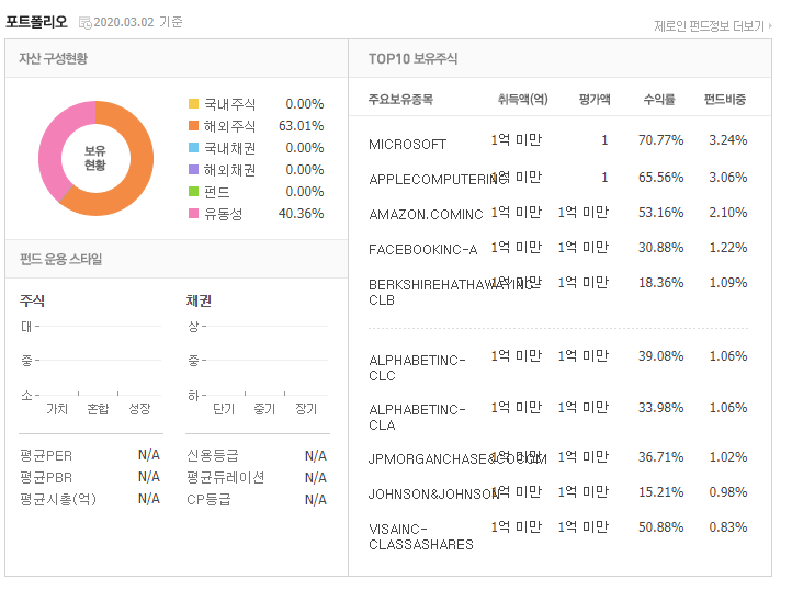 사실 이 펀드는 완벽하게 해외주식펀드라고 설정하기는 어려우나, 올인원 같은느낌? 국내주식,해외주식,국내채권,해외채권,펀드,유동성에 모두 자산을 배분한 포트폴리오를 가지고 있으며, 실제로 다른 펀드에 비해서 유동성 편차가 적은편이다. 다양한 상품에 동시에 투자하는 상품을 찾는다면 이 상품을 선택해도 괜찮은 상품이다.